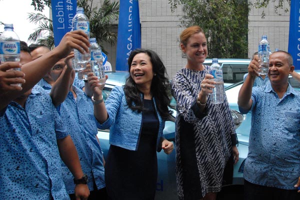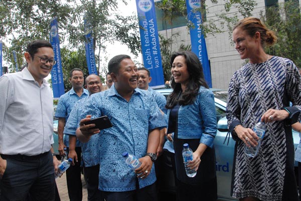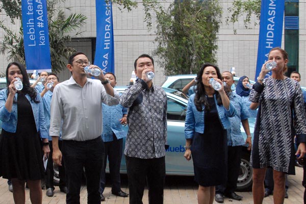 Direktur PT Blue Bird Tbk Andre Djokosoetono (kiri), Presiden Direktur Blue Bird Group Holding Noni Purnomo (tengah) dan Presiden Direktur PT.Tirta Investama (Danone-Aqua) Corine Tap (kanan) melakukan Swa Foto dengan pengemudi taksi Bluebird disela acara kerjasama pemenuhan hidrasi sehat para pengemudi Bluebird, di Jakarta, Selasa 29 Januari 2019. Melalui kerjasama ini, Aqua menjadi air minum resmi para pengemudi Bluebird dan bersama sama mengkampanyekan pentingnya air mineral berkualitas sebagai komponen terbaik dalam menjaga hidrasi khususnya bagi pengemudi bluebird yang harus senantiasa memastikan kenyamanan dan keamanan penumpang.