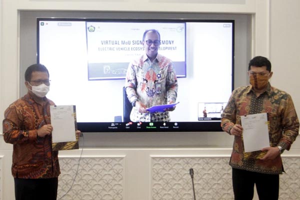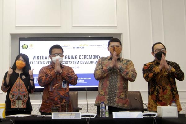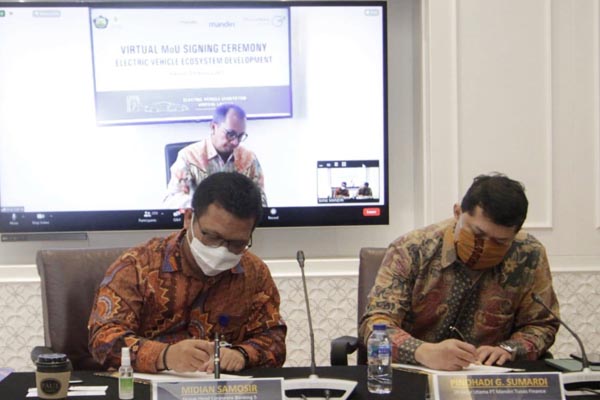 SVP Corporate Banking V Bank Mandiri Midian Samosir (kiri) dan Direktur Utama Mandiri Tunas Finance Pinohadi G. Sumardi sedang menunjukkan naskah MoU kerjasama dengan Direktur Utama Medco Power Indonesia Eka Satria (layar LED) di Jakarta, Jumat, 5 Februari 2021. Bank Mandiri dan Mandiri Tunas Finance berkolaborasi dengan Medco Power Indonesia untuk mengembangkan ekosistem kendaraan listrik di Tanah Air. Inisiatif ini diharapkan dapat mendukung pemerintah yang ingin terus meningkatkan pemanfaatan energi terbarukan.