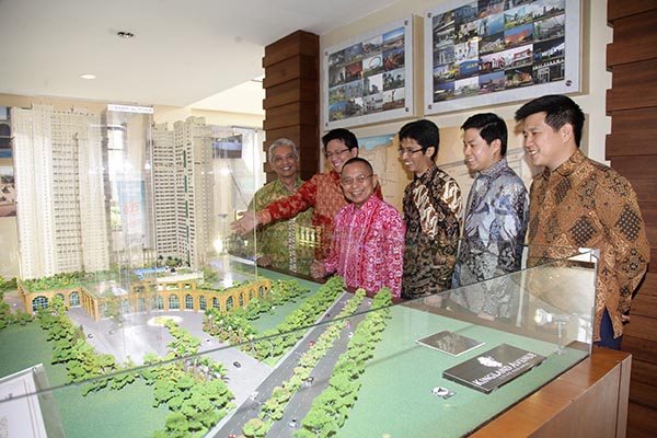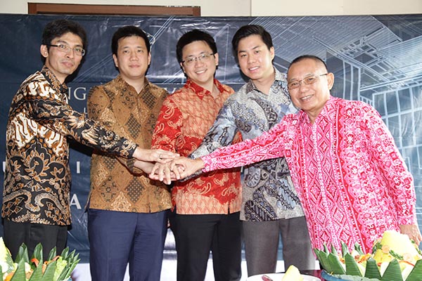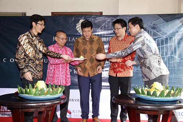 Project Director Chris Chang, Executive Director Jiko Tandijono, President Director PT Hong Kong Kingland Timothy Chang, Director Totalindo Andry Chandra Biantoro, Director PT Promaco Haryono Suwarjo, General Manager Promaco Sigit (kiri ke kanan) bertumpu tangan disela acara komitmen kontruksi pembangunan Kingland Avenue di Serpong, Tangerang Selatan, Banten, Senin 29 April 2019. PT Hong Kong Kingland secara resmi menunjuk PT Totalindo Eka Persada Tbk, sebagai kontraktor utama (main contractor) pembangunan konstruksi Apartemen Kingland Avenue yang terletak di Serpong, Tangsel, Banten.
