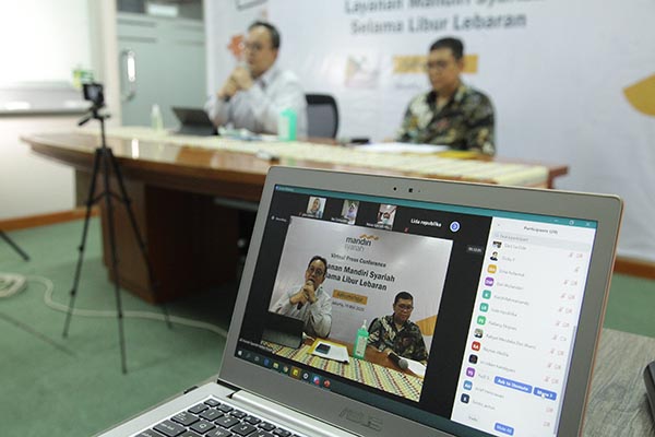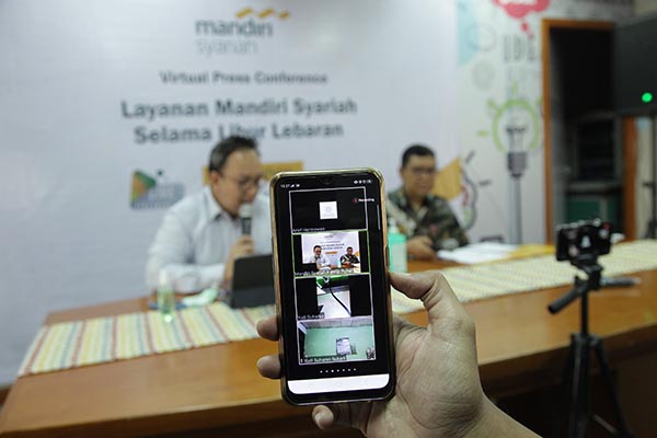 Corporate Secretary Mandiri Syariah Ahmad Reza (kiri) dan Group Head Cash, Trade and Operation Mandiri Syariah Edhie Rosman tengah melakukan konferensi pers secara virtual di Jakarta, Selasa 19 Mei 2020. Mengimbau nasabah mengoptimalkan layanan digital Mandiri Syariah Mobile, Net Banking dan ATM selama libur lebaran 1441 H. Mandiri Syariah memberikan solusi transaksi baik untuk belanja online kebutuhan lebaran ataupun pembayaran zakat melalui layanan digital yaitu Mandiri Syariah Mobile (MSM).