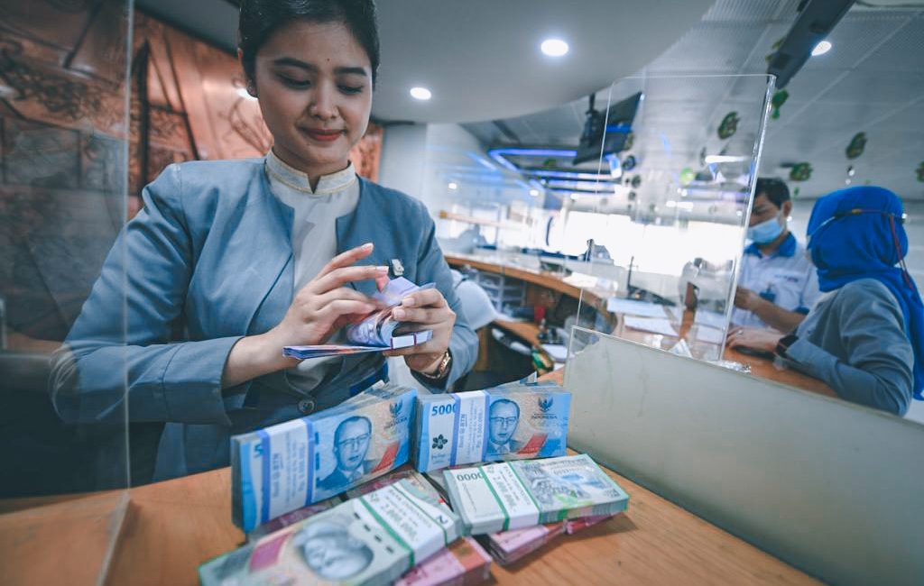 Teller Bank BTN sedang menghitung uang pecahan baru untuk melayani kebutuhan nasabah di Kantor Cabang Bank BTN Harmoni, Jakarta, Rabu, 26 April 2023.