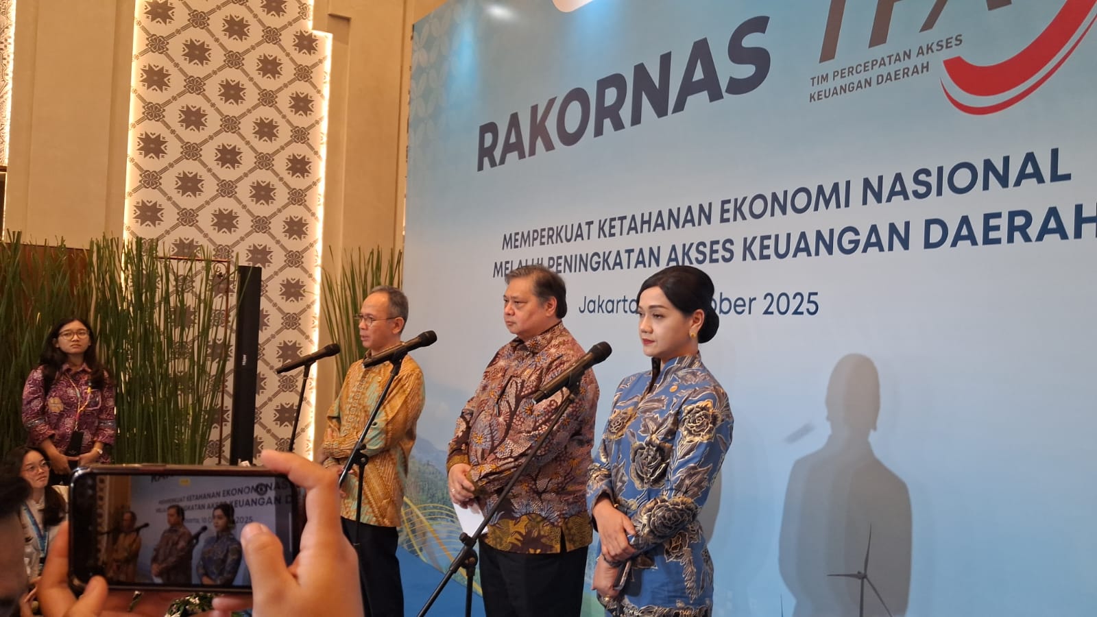 Ketua Dewan Komisioner OJK, Mahendra Siregar, bersama Menteri Koordinator Bidang Perekenomian Airlangga Hartarto, dan Kepala Eksekutif Pengawas Perilaku Pelaku Usaha Jasa Keuangan OJK, Friderica Widyasari Dewi. (Fotoo: Khoirifa)