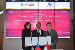 (Kiri – Kanan) Direktur Utama KSEI-Margeret M. Tang , Deputi Komisioner Pengawas Pasar Modal I OJK-Sardjito dan Chairman & CEO TDCC-Sherman Lin berfoto bersama usai penandatanganan MoU di Jakarta,Senin 11 Januari 2015.Kerjasama antara KSEI dan TDCC sebagai Central Securities Depository (CSD) di kawasan Asia Pasifik untuk meningkatkan kemajuan pasar modal di negara masing-masing,dan diharapkan pertukaran informasi dan pengetahuan lebih mudah, sehingga KSEI dan TDCC bisa menjadi CSD yang andal, terpercaya dan mampu bersaing di wilayah regional maupun internasional.(*)