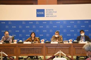 Ketua Dewan Komisioner Otoritas Jasa Keuangan (OJK) Mahendra Siregar, Menteri Keuangan Sri Mulyani Indrawati, Gubernur Bank Indonesia Perry Warjiyo, dan Ketua Dewan Komisioner Lembaga Penjamin Simpanan (LPS) Purbaya Yudhi Sadewa (dari kiri ke kanan) bertumpu tangan usai memberikan keterangan saat Konferensi Pers Hasil Rapat Berkala Komite Stabilitas Sistem Keuangan (KSSK) di Kementerian Keuangan Republik Indonesia, Jakarta, Senin, 1 Agustus 2022. Komite Stabilitas Sistem Keuangan (KSSK) sepakat bahwa kondisi stabilitas sistem keuangan Indonesia tetap terjaga meski di tengah tekanan global.