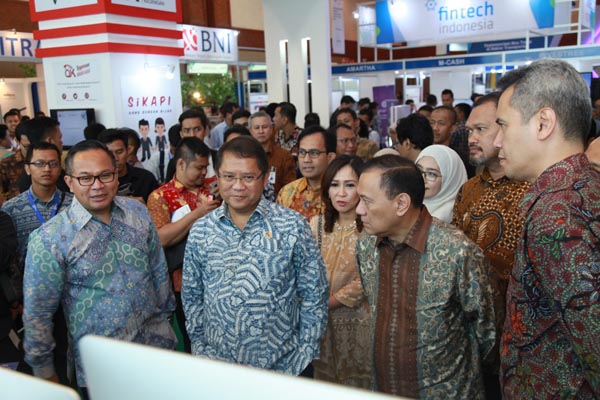 Direktur Compliance Bank Mandiri Ogi Prastomiyono, Ketua Perbanas sekaligus Dirut Bank Mandiri Kartika Wirjoatmodjo, Menkominfo Rudiantara dan Gubernur BI, Agus DW Martowardojo (kiri-ke kanan) tengah mendengarkan penjelasan tentang layanan digital banking Mandiri di booth Bank Mandiri di arena IBEX 2017, Jakarta, Selasa 19 September 2017.