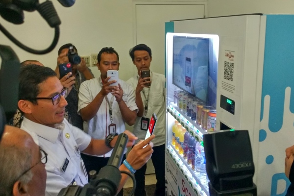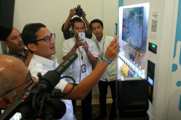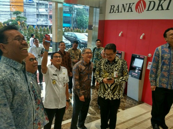 Wakil Gubernur DKI Jakarta, Sandiaga Uno (2 dari kanan) didampingi Direktur Utama Bank DKI, Kresno Sediarsi (4 dari kiri), Komisaris Utama Bank DKI, Honggo Widjojo Kangmasto (paling kanan), beserta direksi dan komisaris Bank DKI menunjukkan aplikasi JakOne Mobile saat mengunjungi kantor pusat Bank DKI di Jakarta, (15/11). sejak diluncurkan Agustus 2017, per Oktober 2017, jumlah pengguna JakOne Mobile Bank DKI telah mencapai 18 ribu pengguna dengan nilai transaksi sebesar Rp17 milyar. Jumlah merchant yang telah menerima sistem pembayaran JakOne Pay berjumlah lebih dari 1700 merchant. (*)