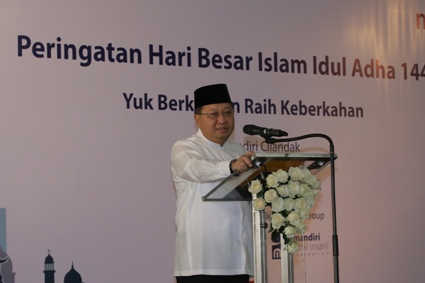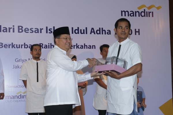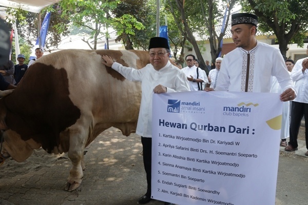 Wakil Direktur Utama Bank Mandiri Sulaiman A Ariyanto (kiri) menyerahkan hewan kurban kepada Ketua Panitia Pemotongan Kurban Mandiri Group Tri Nugroho di Jakarta, Minggu 11 Agustus 2019. Pada Idul Adha 1440 H ini, Sebanyak 110 ekor sapi dan 171 ekor kambing hewan kurban dari karyawan Bank Mandiri, Perusahaan Anak dan Lembaga Mandiri Amal Insani (MAI) disalurkan untuk fakir miskin ke berbagai wilayah Indonesia melalui Kantor Pusat dan Kantor Wilayah/Cabang Bank Mandiri.