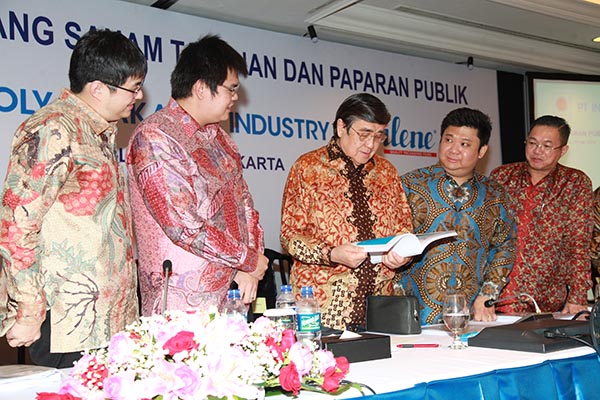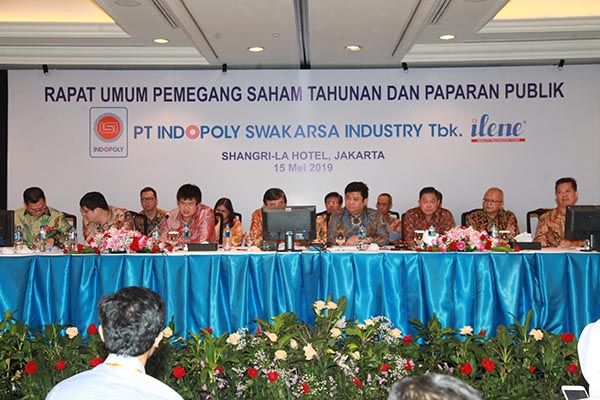 Presiden Direktur PT Indopoly Swakarsa Industry Tbk, Henry Halim (tengah) berbincang bersama direksi lainnya usai Rapat Umum Pemegang Saham (RUPS) yang dilakukan di Jakarta, Rabu 15 Mei 2019. Pada akhir tahun 2018, PT Indopoly Swakarsa Industry Tbk membukukan pertumbuhan laba bersih 130,7% menjadi US$4,85 juta dibandingkan akhir tahun 2017 sebesar US$2,10 juta. Atas persetujuan RUPS, perseroan membagikan dividen tunai sebesar 27,57% dari laba bersih atau setara Rp3 per lembar saham. Dengan demikian total laba bersih yang dialokasikan sebagai dividen mencapai US$1,34 juta.