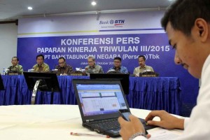 Direktur Utama PT Bank Tabungan Negara (Persero) Tbk (BTN),Maryono (ketiga kiri) didampingi jajaran direksi bersiap memberikan keterangan pers tentang Kinerja BTN Triwulan III di Jakarta, Senin 26 Oktober 2015. BTN mencatat laba bersih pada Triwulan III 2015 sebesar Rp1,22 trilliun atau tumbuh 61,8 persen dibandingkan periode yang sama tahun lalu sebesar Rp755 milliar.Kinerja perseroan rata-rata tumbuh diatas industri nasional.(Budi Urtadi)