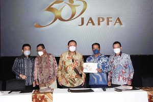 Kepala Divisi Pengawasan Keuangan (Financial Controller) Erwin Djohan, Direktur Japfa Leo Handoko Laksono, Direktur Japfa Antonius Harwanto, Kepala Divisi Keuangan Korporasi Putut Djagiri dan Direktur Japfa Rachmat Indrajaya (kiri ke kanan) berbincang usai Public Expose untuk Rapat Umum Pemegang Saham Tahunan (RUPST) dan Rapat Umum Pemegang Saham Luar Biasa (RUPSLB) PT Japfa Comfeed Indonesia Tbk (JAPFA), di Jakarta, Rabu 6 April 2022. JPFA berhasil membukukan laba bersih sebesar Rp2,02 triliun sepanjang 2021, naik 120,63 persen dibandingkan dengan capaian 2020 sebesar Rp916,71 miliar. Laba per saham yang dapat diatribusikan kepada pemilik entitas induk mengalami kenaikan dari Rp79 pada 2020 menjadi Rp174 pada 2021.