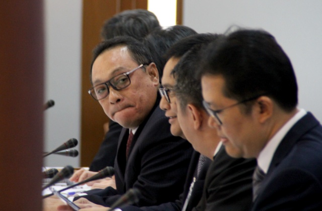 Direktur Utama PT Bank Tabungan Negara (Persero) Tbk. Maryono (ketiga kiri) bersama jajaran Direksi Bank BTN Nixon Napitupulu, Handayani, Iman Nugroho Soeko, Oni Febriarto, dan Mahelan Prabantarikso dalam Paparan Kinerja Bank BTN Kuartal II/2017 di Menara BTN, Jakarta, Senin 24 Juli 2017. Pada paruh pertama tahun ini, laba bersih Bank BTN tercatat naik 21,95% secara tahunan (year-on-year/yoy) menjadi Rp1,27 triliun dan penyaluran kredit Bank BTN tumbuh 18,81% yoy menjadi Rp177,4 trilliun. Bank BTN tetap berkomitmen memberikan dukungan dalam program satu juta rumah dengan target tahun 2017 sebanyak 666.000 unit rumah. Per 30 Juni 2017 perseroan telah merealisasi lebih dari 50% atau sebanyak 370.173 unit rumah dengan nilai kredit mencapai Rp39,01 triliun.(Budi Urtadi)