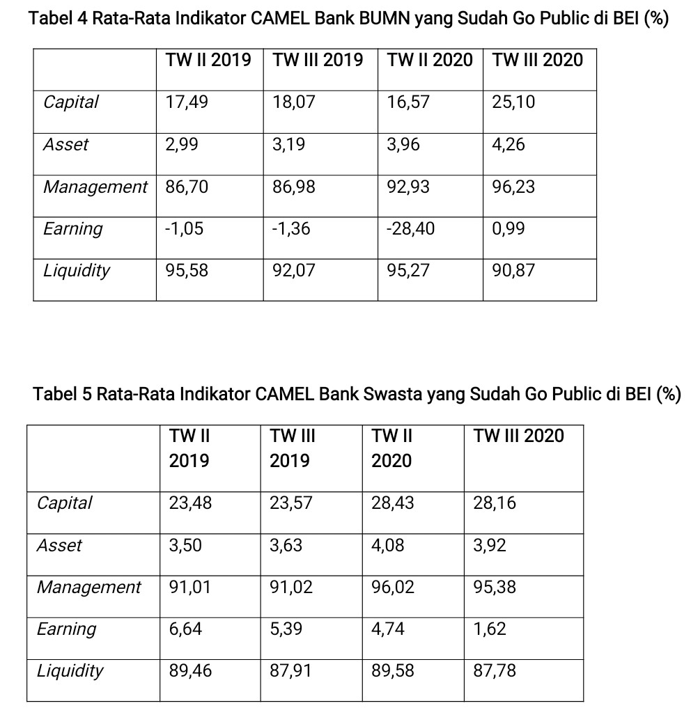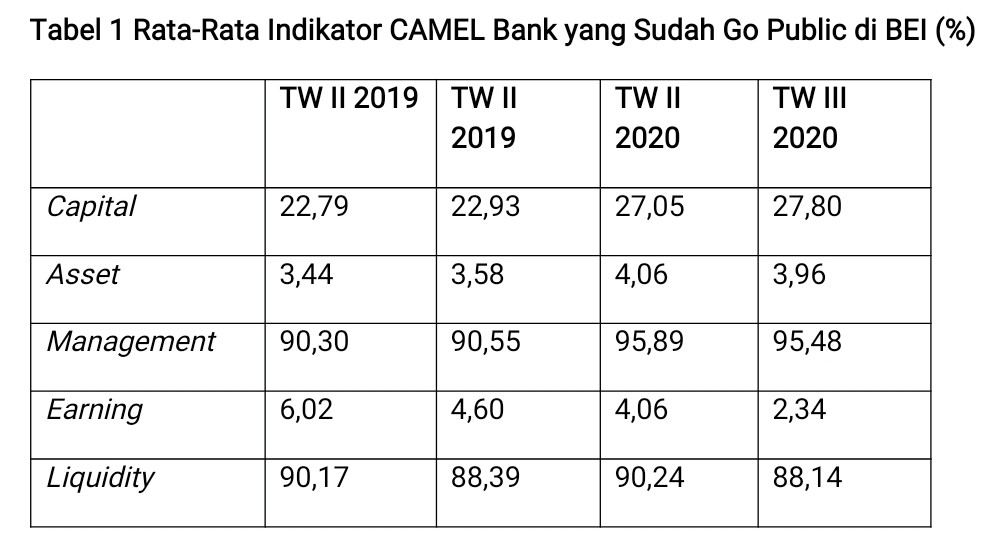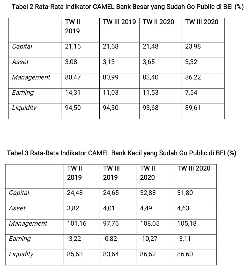 Efektifkah langkah pencegahan itu? Secara faktual memang belum ada bank gagal. Untuk objektifnya bisa digunakan indikator kesehatan bank yang selama ini diandalkan sebagai deteksi dini, yaitu capital, asset, management, earning, liquidity (CAMEL). Dari data CAMEL yang diambil dari laporan keuangan bank-bank yang sudah go public, secara umum kesehatan bank memburuk dibandingkan dengan sebelum pandemi COVID-19. Perode sebelum pandemi COVID-19 diambil triwulan kedua (TW II) dan triwulan ketiga (TW III) 2019, sementara periode pandemi COVID-19 adalah TW II dan TW III 2020.