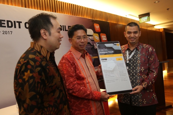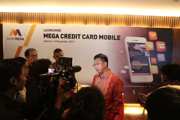 PT Bank Mega Tbk secara resmi memperkenalkan Mega Mobil Credit Card, yaitu aplikasi yang dapat mengakses informasi mengenai kartu kredit Bank Mega melalui mobile phone secara mudah dan cepat. Peluncuran dilakukan oleh Direktur Utama Bank Mega Kostaman Thayib (tengah) didampingi oleh Credit Card & Personal Loan Merketing Head Alfons Kurnia (kiri) dan IT E-Channel Head Yoyo Juhartoyo (kanan) di Menara Bank Mega, Jakarta (14/12). (*)