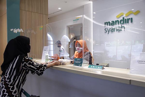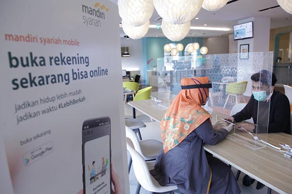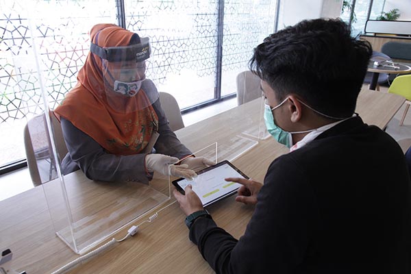 Nasabah tengah mengakses layanan digital branch Mandiri Syariah Thamrin Jakarta, Rabu 3 Juni 2020. Mandiri Syariah menyediakan layanan Kantor Cabang dengan tetap merujuk pesan Pemerintah diantaranya penerapan protokol kesehatan yang ketat dan akselerasi teknologi baik terkait layanan nasabah ataupun mekanisme kerja di tengah era new normal. Mandiri Syariah mencatatkan pertumbuhan DPK sebesar 15,61 % yoy dari Rp86,86 triliun per April 2019 menjadi Rp100,42 triliun per April 2020 dengan 57%nya adalah dana murah.