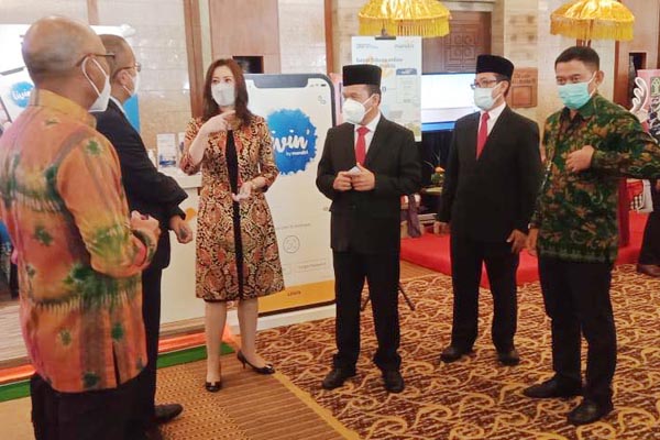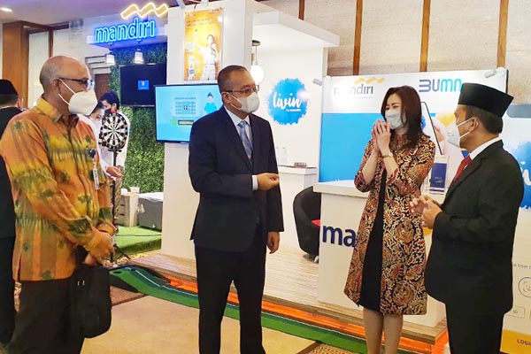 Dirjen Administrasi Hukum Umum (AHU) Kemenkumham Cahyo Rahadian Muzhar, Wadirut Bank Mandiri Alexandra Askandar dan Kepala Kanwil Kemenkumham Provinsi Bali Jamaruli Manihuruk (kiri ke kanan) tengah berbincang usai peresmian pembayaran layanan fidusia online di Bali, Kamis 10 Juni 2021. Bank Mandiri mengembangkan solusi pembayaran online yang mengintegrasikan portal AHU online dengan channel pembayaran Microsite Bank Mandiri untuk memudahkan notaris melakukan pembayaran PNBP fidusia, salah satu layanan utama Ditjen AHU Kemenkumham. Inisiatif ini akan terus dikembangkan sebagai dukungan Bank Mandiri kepada Kementerian dan Lembaga Pemerintah dalam menciptakan solusi penerimaan negara yang transparan dan akuntabel.