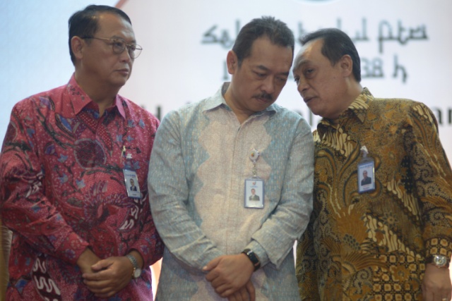 Direktur Utama PT Bank Tabungan Negara (Persero) Tbk. Maryono (paling kanan) bersama dengan Komisaris Pertamina Sahala Lumban Gaol, dan Deputi Bidang Industri Pertambangan, Industri Strategis, dan Media Kementerian BUMN Fajar Harry Sampurno dalam acara Halal Bil Halal di Menara BTN, Jakarta, Selasa 4 Juli 2017. Dalam rangka mendukung Program Sejuta Rumah, Bank BTN mematok akan menyalurkan kredit untuk 666.000 unit rumah pada 2017. Sampai dengan Mei 2017, perseroan telah merealisasi 337.309 unit rumah atau lebih dari 50% target program sejuta rumah tahun 2017 telah dipenuhi BTN.(Budi Urtadi)