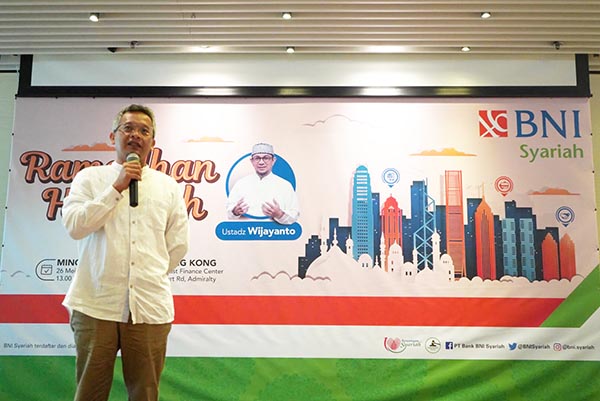 Pemimpin BNI Hongkong Wan Andi, Ustadz Wijayanto, Pemimpin Divisi Dana Ritel BNI Syariah Bambang Sutrisno dan Direktur BRL Hongkong, Eko Kristianto (dari kiri) saat acara literasi edukasi keuangan syariah dengan tema Hijrah di Ramadhan Hasanah kerjasama BNI Syariah bersama BNI Hongkong dan BRL Hongkong bertempat di BNI Admiralty, Hongkong, Minggu, 26 Mei 2019. BNI Syariah berusaha meningkatkan literasi Pekerja Migran Indonesia (PMI) di Hongkong. Hal ini dilakukan melalui kegiatan edukasi keuangan syariah dengan tema Hijrah di Ramadhan Hasanah.