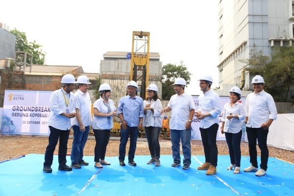 Ketua Umum Pengurus Koperasi Astra Pongki Pamungkas (kedua kiri) menjelaskan maket rancangan bangunan gedung baru Koperasi Astra didampingi Wakil Ketua Umum Pengurus Koperasi Astra Bambang Wijanarko (kanan), Deputy Chief of Corporate Affairs Astra Riza Deliansyah (kiri), Head of Corporate Communications Astra Boy Kelana Soebroto (kedua kanan) seusai peluncuran logo baru dan groundbreaking gedung baru Koperasi Astra di kawasan Cempaka Putih, Jakarta Pusat (28/10). (*)