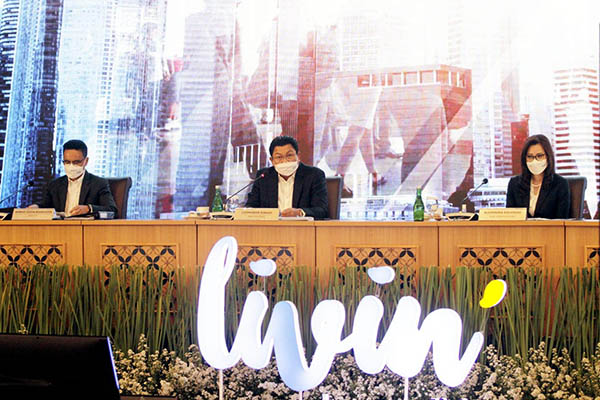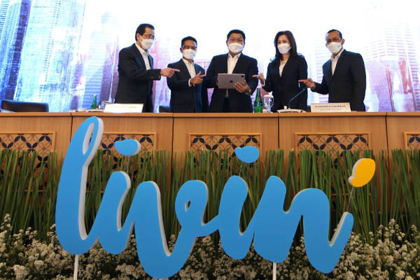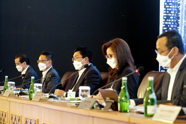 Direktur Information Technology Bank Mandiri Timothy Utama, Direktur Manajemen Risiko Bank Mandiri Ahmad Siddik Badruddin, Direktur Utama Bank Mandiri Darmawan Junaidi, Wakil Direktur Utama Alexandra Askandar dan Direktur Keuangan & Strategi Sigit Prastowo (kiri ke kanan) saat menyampaikan paparan kinerja Bank Mandiri Triwulan II – 2021 di Jakarta, Kamis, 29 Juli 2021. Mendorong pemulihan ekonomi dari dampak pandemi, Bank Mandiri menumbuhkan penyaluran kredit konsolidasi pada Juni 2021 sebesar 16,4% yoy menjadi Rp 1.014,3 triliun, termasuk pembiayaan ke segmen UMKM yang naik 20,1% menjadi Rp 98,3 triliun. Sedangkan laba bersih pada akhir Juni 2021 tumbuh 21,45% menjadi Rp12,5 triliun.