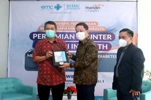 Direktur RS EMC Pekayon Dr. Deddy Nugroho, MARS, Direktur Utama Mandiri Inhealth Budi Tampubolon, Jusup Halimi President Director EMC Healthcare pada acara peresmian konter khusus Mandiri Inhealth di RS EMC Pekayon, Bekasi, Kamis, 12 Mei 2022. Konter ini dapat berfungsi sebagai sumber informasi, penanganan keluhan peserta, pengendalian layanan terpadu serta meminimalisir waktu tunggu. Konter Mandiri Inhealth dapat diakses peserta Mandiri Inhealth Indemnity dan Managed Care mulai dari plan Silver hingga Diamond.