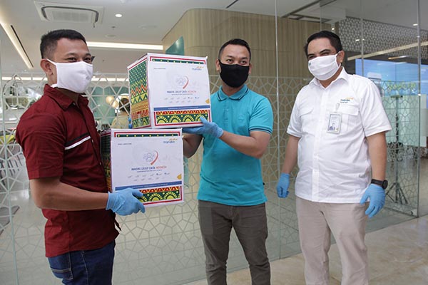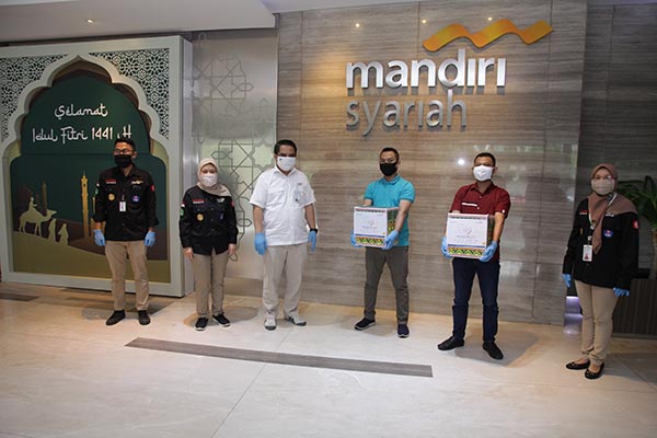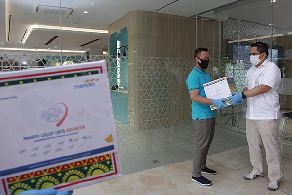 Direktur Mandiri Syariah Anton Sukarna (kanan) memberikan bantuan kepada perwakilan masyarakat terdampak Covid-19 sebagai implementasi program Mandirian Cinta Indonesia di Kantor Pusat Mandiri Syariah Jakarta, Rabu 27 Mei 2020. Mandiri Syariah bersinergi dengan Mandiri Group memberikan donasi Rp1,82 miliar kepada lebih dari 2.600 penerima dari total bantuan Rp17 miliar sebagai bentuk kepedulian terhadap penangangan Covid-19 di Indonesia.
