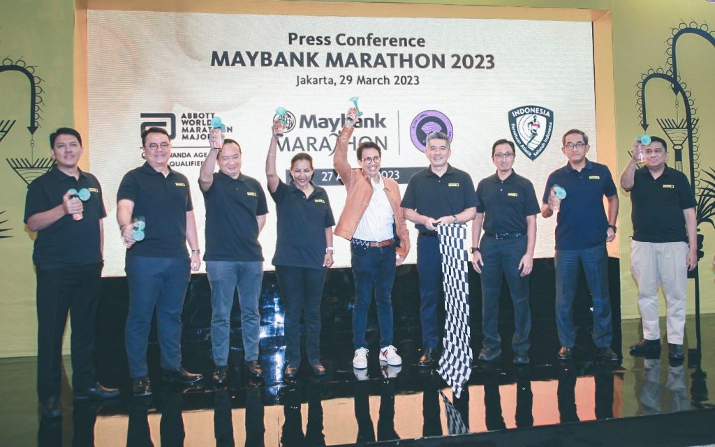 Presiden Direktur Maybank Indonesia Taswin Zakaria (keempat kanan) didampingi Sekjen PB PASI Tigor Tanjung (tengah), Race Director Maybank Marathon 2023 Widya Permana (ketiga kanan) dan jajaran direksi Maybank Indonesia mengibarkan bendera start dalam konferensi pers Maybank Marathon 2023 di Jakarta, Rabu, 29 Maret 2023.