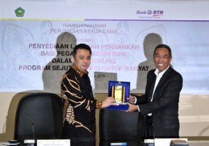 Direktur PT Bank Tabungan Negara (Persero) Tbk (BTN),Oni Febrianto (kiri) berjabat tangan dengan Sekjen Kementerian Agama (Kemenag), Nur Syam (kanan) usai penandatanganan kerjasama di Jakarta, Rabu 4 November 2015. BTN bekerjasama dengan Kementerian Agama untuk memberikan layanan perbankan dalam memenuhi kebutuhan rumah bagi PNS dilingkungan Kemenag guna mendukung program sejuta rumah.(Budi Urtadi)