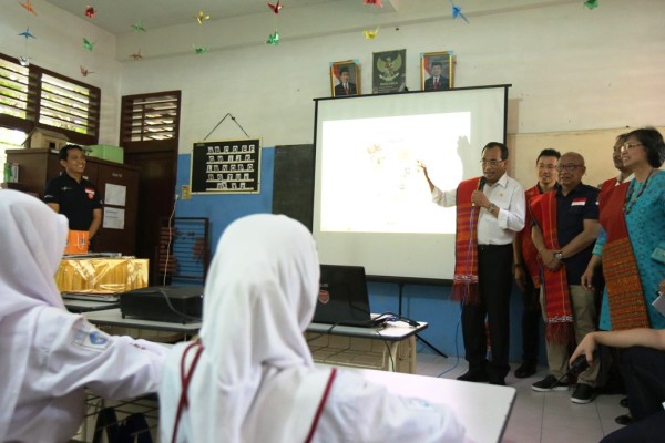 Menteri Perhubungan Republik Indonesia Budi Karya Sumadi (ketiga kanan) didampingi Deputi Bidang Tumbuh Kembang Anak Kemen PPPA Leny Nurhayanti Rosalin (kanan) dan Chief of Corporate Communications, Social Responsibility & Security PT Astra International Tbk Pongki Pamungkas (kedua kanan) memberi semangat dan berpesan kepada siswa-siswa SDN 028067 Kota Binjai untuk selalu rajin belajar dan berhati-hati di jalan raya pada rangkaian acara HUT ke-60 Astra di Medan (24/9).