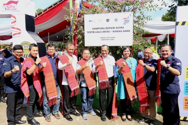 Menteri Perhubungan Republik Indonesia Budi Karya Sumadi (keempat kanan) bersama Walikota Binjai M. Idaham (tengah), Plt. Dirjen Perhubungan Darat Kementerian Perhubungan RI Hindro Surahmat (keempat kiri), Deputi Bidang Tumbuh Kembang Anak Kemen PPPA Leny Nurhayanti Rosalin (ketiga kanan), Chief of Corporate Communications, Social Responsibility & Security PT Astra International Tbk Pongki Pamungkas (kedua kanan), Chief of Corporate Human Capital Development Astra International Aloysius Budi Santoso (ketiga kiri), Ketua Koordinator Grup Astra Wilayah Medan Sutadi (kedua kiri) dan Ketua Panitia HUT ke-60 Astra di Medan Badrun Radhi (kiri) usai meresmikan Kampung Berseri Astra Cengkeh Turi sebagai Kampung Ramah Anak – Tertib Lalu Lintas pada rangkaian acara HUT ke-60 Astra di Medan (24/9).