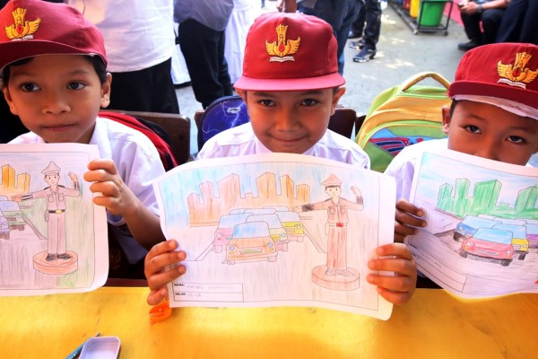 Siswa-siswa SDN 028067 Kota Binjai selesai mewarnai gambar dengan tema keselamatan lalu-lintas (24/9). Menteri Perhubungan Republik Indonesia Budi Karya Sumadi membuka kegiatan Inspirasi 60 Tahun Astra sekaligus mencanangkan Kampung Berseri Astra Cengkeh Turi, Binjai, Sumatera Utara sebagai Kampung Ramah Anak – Tertib Lalu Lintas pada rangkaian acara HUT ke-60 Astra di Medan. (*)