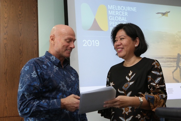 (kiri-kanan): Jovita Sadrach, Wealth Leader Mercer Indonesia, Bill Johnston Presiden Direktur Mercer Indonesia, Andry Lie, Growth Leader Mercer Indonesia, dalam group interview di Jakarta, Senin (21/10). Bill Johnston mengungkapkan sistem pensiun Indonesia berada di grade C dan memiliki beberapa fitur yang bagus, tapi juga memiliki beberapa risiko atau kekurangan yang harus diatasi. Indonesia berada di grade yang sama dengan beberapa negara maju seperti Spanyol, Austria, dan Italia. (*)