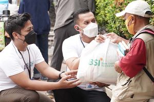 Pegawai Milenial PT Bank Syariah Indonesia Tbk (BSI) tengah memberikan paket Sembako kepada masyarakat yang membutuhkan di Jakarta, Senin, 13 Juni 2022. Pemberian paket bantuan tersebut merupakan bagian dari ungkapan syukur dan kepedulian atas dukungan Masyarakat kepada BSI hingga mampu mencatatkan pertumbuhan kinerja secara konsisten. Kegiatan itu juga merupakan bagian dari implementasi budaya AKHLAK Badan Usaha Milik Negara (BUMN). Sepanjang triwulan I/2022, BSI mencatatkan laba bersih mencapai Rp 987,68 Miliar dengan rasio NPF net sebesar 0,90%.