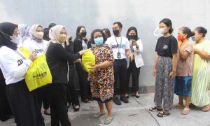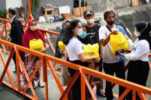 Karyawan usia milenial PT Bank Tabungan Negara (Persero) Tbk. membagikan bantuan paket sembako kepada masyarakat tidak mampu di sekitar kawasan Menara Bank BTN di Jakarta, Senin, 11 April 2022. Penyerahan ratusan paket sembako tersebut merupakan komitmen Bank BTN untuk memberikan manfaat bagi masyarakat Indonesia terutama dalam mendukung tercapainya pemenuhan hak dasar manusia. Bantuan bahan pangan tersebut juga disalurkan sebagai bentuk Tanggung Jawab Sosial dan Lingkungan (TJSL) Bank BTN sebagai bagian dari BUMN.