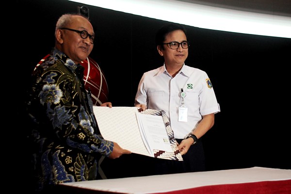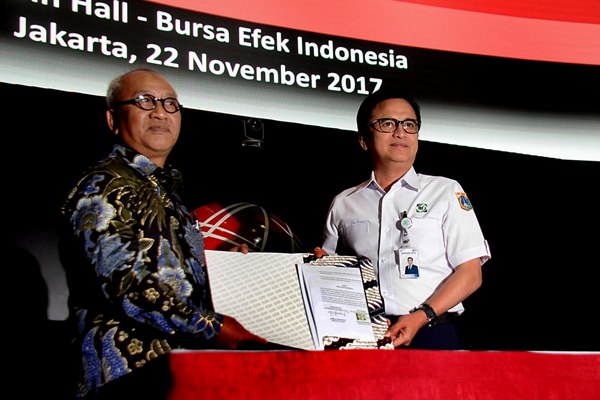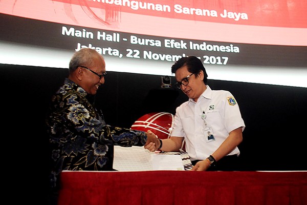 Direktur Utama Totalindo, Donald Sihombing (kiri) dan Direktur Utama PD Pembangunan Sarana Jaya, Yoori C Pinontoan (kanan) bertukar naskah kerja sama yang telah ditandatangani di Bursa Efek Indonesia, Jakarta, Rabu (22/11). PT Totalindo Eka Persada Tbk (“TOTALINDO”) menandatangani perjanjian kerja sama dengan PD Pembangunan Sarana Jaya untuk mengembangkan kawasan terpadu yang terdiri atas tower apartemen, perkantoran dan area komersil. Proyek ini akan dibangun di atas lahan seluas 1,8 ha dengan total nilai proyek Rp 3 triliun yang terletak di samping terminal Lebak Bulus – Jakarta Selatan. (*)