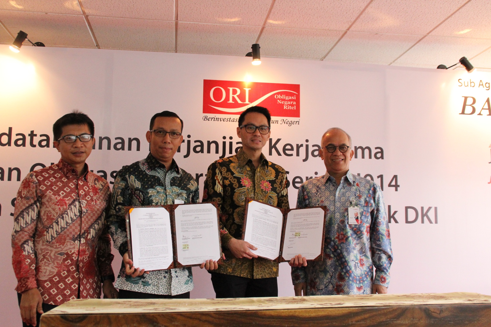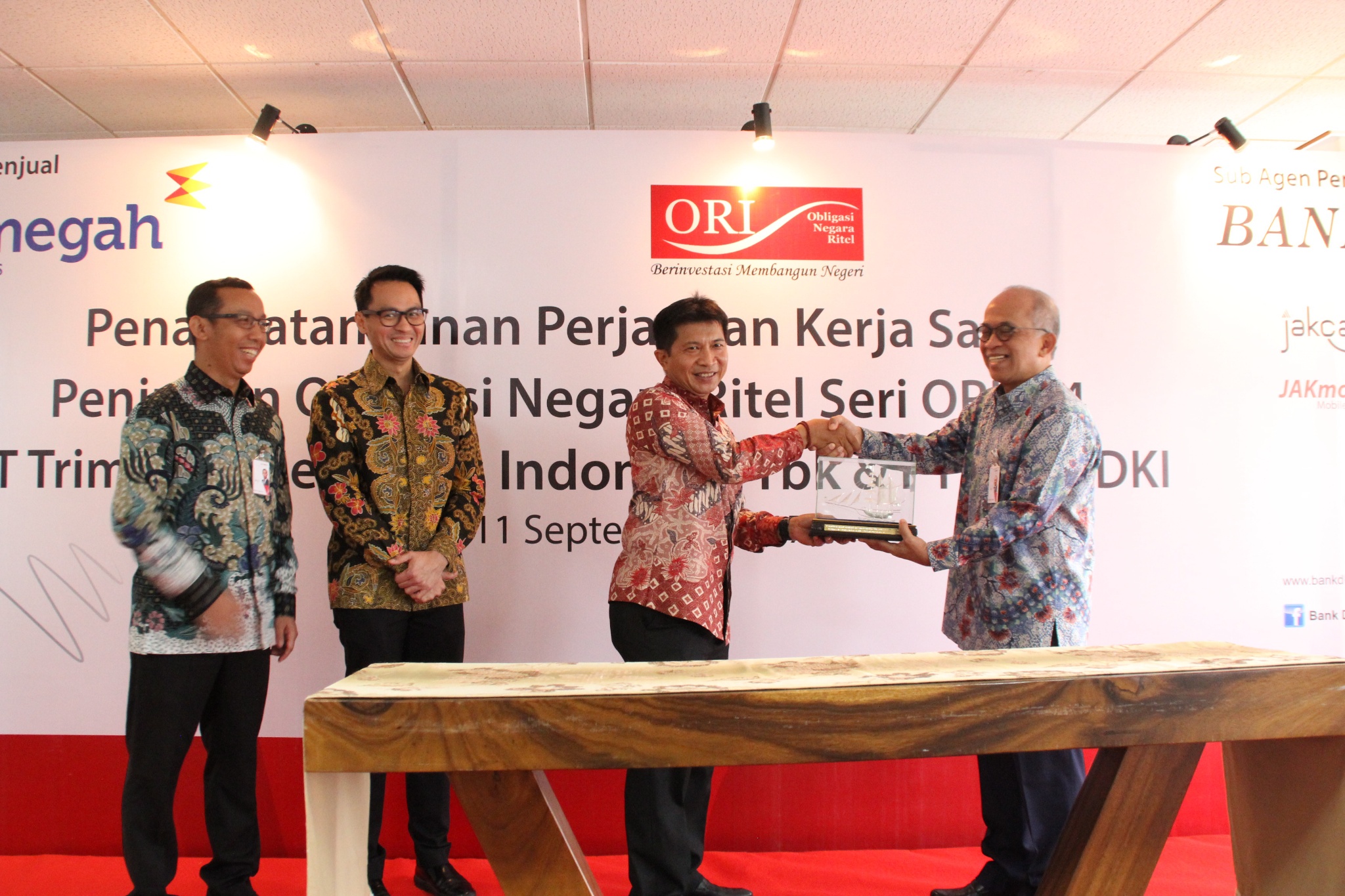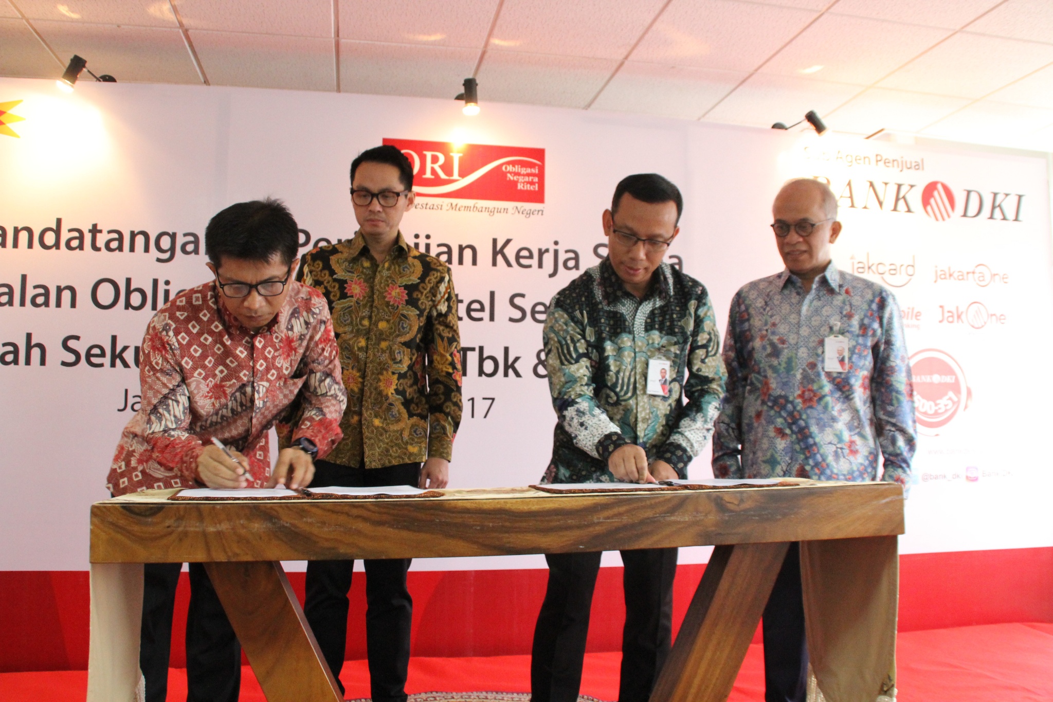 Direktur Utama Bank DKI, Kresno Sediarsi (paling kanan) menyaksikan Direktur Keuangan Bank DKI, Sigit Prastowo (tengah) bersama Direktur Utama PT Trimegah Sekuritas, Stephanus Turangan (paling kiri) menandatangani Perjanjian Kerja sama Penjualan Obligasi Negara Ritel Seri ORI 014 senilai Rp20 miliar di Jakarta, (11/09).