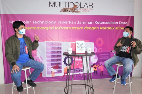 Division Head Server, PT Multipolar Technology Tbk, Jeffry Tjiung Sendjaja (kanan) tengah berbincang dengan  Presales Server X86 Manager, PT Multipolar Technology Tbk, Adrian Kustiawan (kiri) disela acara webinar yang diselenggarakan Multipolar Technology bertajuk Simplify, Modernize & Secure Your IT Infrastructure yang diselenggarakan di Jakarta, Selasa, 16 Februari 2021. Saat ini penerapan infrastruktur data center berbasis hyperconverged infrastructure (HCI) menjadi kebutuhan strategis perusahaan guna mengurangi kompleksitas dalam mengelola beragam perangkat, sehingga bisa meningkatkan efisiensi serta menurunkan biaya operasional. Tak kalah pentingnya adalah memastikan ketersediaan data setiap saat dibutuhkan dengan proses backup yang tepat. Multipolar Technology menjawab kebutuhan ini dengan menawarkan solusi Hyperconverged Infrastructure (HCI) Lenovo ThinkAgile HX dengan Nutanix Mine yang dilengkapi solusi backup dan replikasi data dari Veeam.