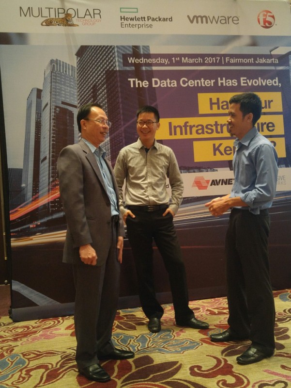 Jip Ivan Sutanto, Solution & Infrastructure Business Director – PT Multipolar Technology Tbk, Edwardo Jahja, Presales Manager F5 – Exclusive Network Indonesia, dan Iptahul Palah, Presales Engineer – Avnet Technology Indonesia di sela-sela Seminar “Hyper Converged: The Data Center Has Evolved, Has Your Infrastructure Kept Up?”, di Jakarta, Rabu 1 Maret 2017.