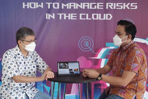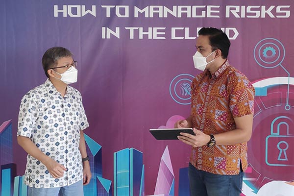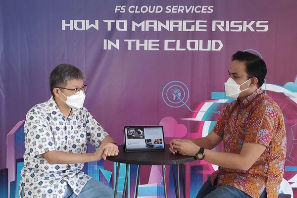 Director Hybrid Infrastructure Services Business PT Multipolar Technology Tbk, Yohan Gunawan (kiri) dan Head Presales Network PT Multipolar Technology Tbk, Gary Adrian (kanan) tengah berbincang disela acara webinar F5 Cloud Services “How to Manage Risks in the Cloud” yang diadakan di Jakarta, Rabu, 10 Maret 2021. Webinar tersebut mengenai kemudahan pengelolaan perangkat security dan application services dengan solusi berbasis cloud dari F5 Cloud Services yang lebih fleksibel dan efesien agar terhindar dari kompleksitas pengelolaan infrastruktur, web application bisa terus diakses dan aman.
