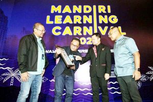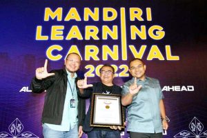 SVP Human Capital Strategy & Talent Management Bank Mandiri Steven A. Yudhianto, Direktur Kepatuhan dan SDM Bank Mandiri Agus Dwi Handaya, Wakil Direktur Museum Rekor Dunia Indonesia (MURI) Osmar Semesta Susilo, Deputi Bidang Sumber Daya Manusia (SDM), Teknologi, dan Informasi Kementerian BUMN Tedi Bharata (kiri ke kanan) saat menerima penyerahan Sertifikat MURI untuk kegiatan Mandiri Learning Carnival (MLC) di Jakarta, Jumat, 23 September 2022. Sebagai inisiatif menghadapi persaingan serta beradaptasi dengan perkembangan terkini khususnya industri perbankan, Bank Mandiri menggelar Mandiri Learning Carnivals (MLC) berupa rangkaian pelatihan perbankan selama tiga bulan secara hybrid serta diikuti 72.530 karyawan di seluruh kantor regional dan kantor pusat. Menghadirkan puluhan tokoh nasional dan pembicara inspiratif, MLC berhasil meraih pengakuan MURI sebagai Program Pelatihan Perbankan kepada Karyawan Terbanyak dalam 3 Bulan.
