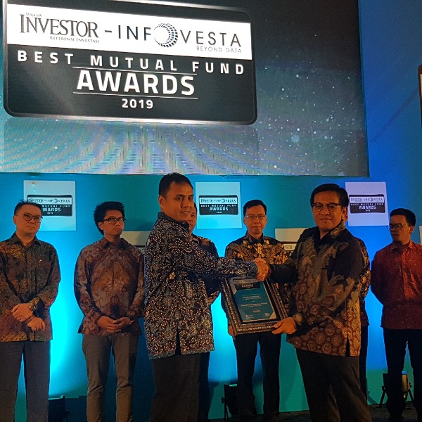 PT Narada Aset Manajemen menerima dua penghargaan di ajang Best Mutual Fund Awards 2019 (26/3). Penghargaan kedua diserahkan oleh Direktur Pengelolaan Investasi Otoritas Jasa Keuangan (OJK) Sujanto (ke-4 dari kiri) dan diterima oleh Direktur Investasi PT Narada Aset Manajemen Bayu Praskoro Nugroho. (*)