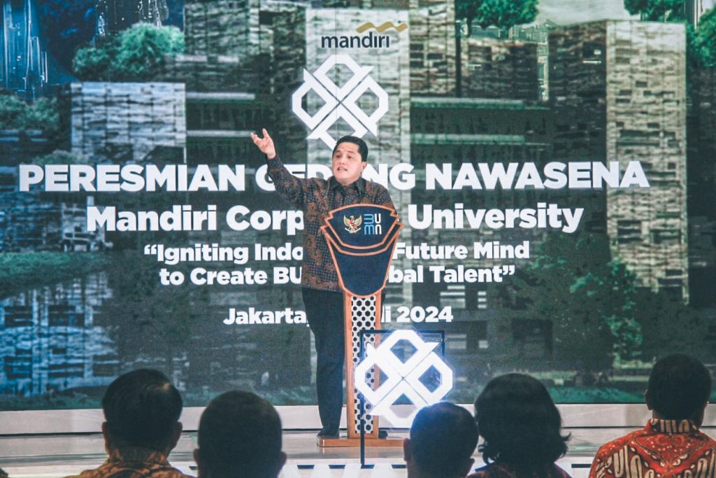 Menteri Badan Usaha Milik Negara Erick Thohir memberikan sambutan saat peresmian Gedung Nawasena Mandiri Corporate University di Kawasan Mandiri Wijayakusuma, Jln Daan Mogot, Jakarta.