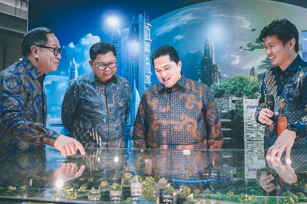 Wakil Menteri Badan Usaha Milik Negara (BUMN) Kartika Wirjoatmodjo, Direktur Utama Bank Mandiri Darmawan Junaidi, Menteri Badan Usaha Milik Negara Erick Thohir dan SVP Corporate Real Estate Bank Mandiri Koga Husin sedang mengamati maket dalam peresmian Gedung Nawasena Mandiri Corporate University di Kawasan Mandiri Wijayakusuma, Jln Daan Mogot, Jakarta Barat, Selasa 30 Juli 2024.