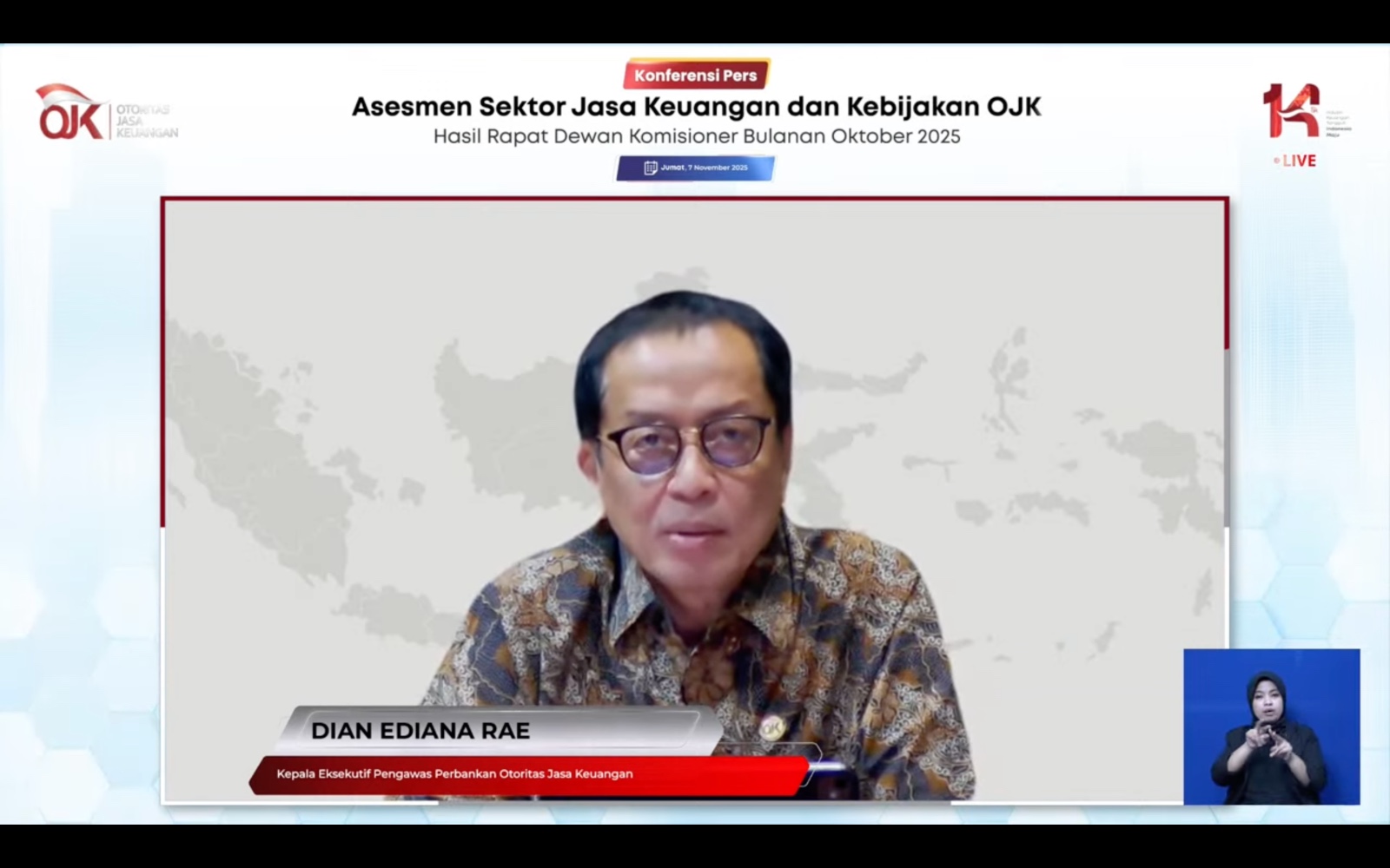 “Kinerja intermediasi perbankan pada saat ini stabil dengan profil risiko yang terjaga dan aktivitas operasional perbankan tetap optimal untuk memberikan layanan keuangan bagi masyarakat. Di September 2025 kredit tumbuh sebesar 7,70 persen yoy,” kata Kepala Eksekutif Pengawas Perbankan OJK, Dian Ediana Rae dalam konferensi pers hasil Rapat Dewan Komisioner (RDK) OJK secara virtual, Jumat, 7 November 2025.