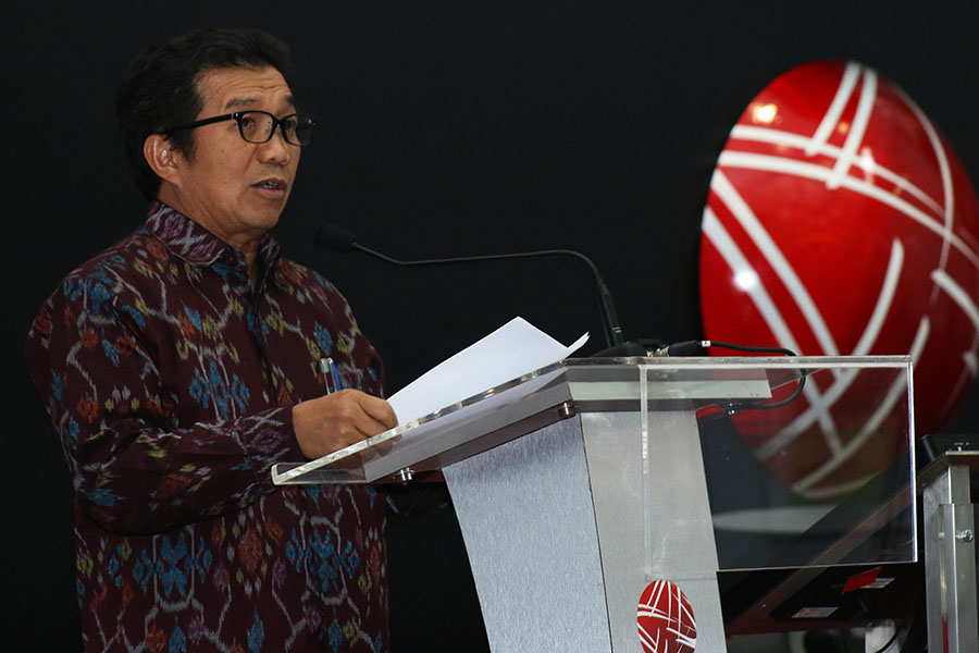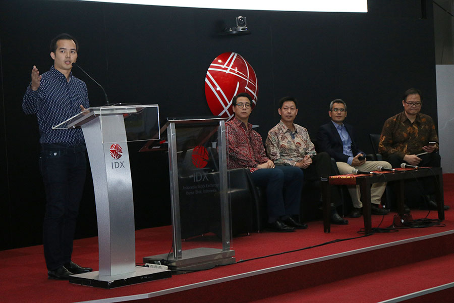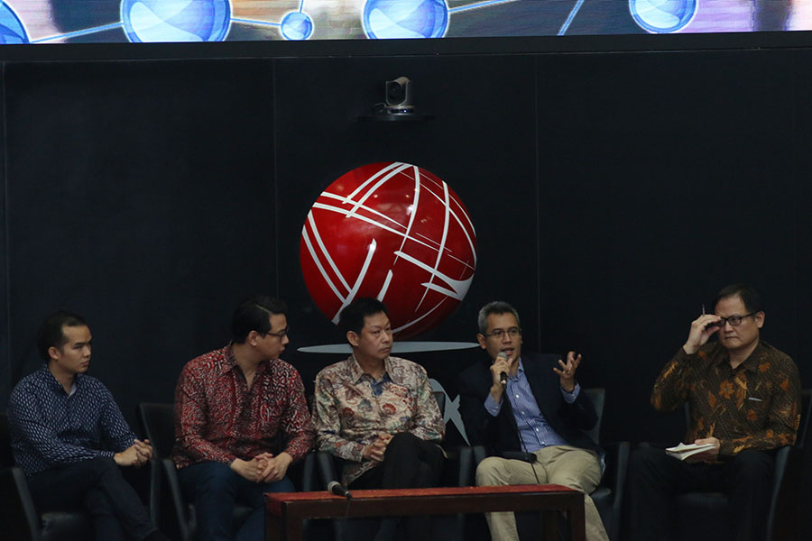 Ketua Dewan Komisioner Otoritas Jasa Keuangan (OJK), Muliaman D Hadad (tengah) bersama wakil Ketua Komisioner, Rahmat Waluyanto (kanan) didampingi Direktur Penilaian Perusahaan Bursa Efek Indonesia, Samsul Hidayat (kiri) melakukan penekanan tombol sebagai simbolis peresmian pembentukan Forum Pakar Fintech Nasional di Jakarta, Jumat 16 Juni 2017. Forum tersebut dibentuk sebagai wadah pengembangan industri Fintech agar dapat memfasilitasi koordinasi antarlembaga, kementerian dan pihak-pihak terkait. (Himawan Nugraha)