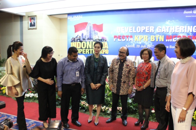Direktur Bank BTN Handayani (keempat kiri) bersama Direktur Marketing And Communication Masgroup Nurry Dalimunte (kiri), Direktur Marketing Duta Putra Land Ester Santoso (kedua kiri), Deputi GM Perum Perumnas Ari Indrianto (ketiga kiri), Direktur Utama PT Adhouse Indonesia Cipta Soedirman Zakaria (keempat kanan), Head Of Non Subsidized Mortgage & Consumer Lending Division Suryati Agustinar (ketiga kanan), Head Of Subsidized Mortgage Division Hirwandi Gafar (kedua kanan) dan Head Of Detail Funding & Services Division Nasril (kanan) saat acara developer gathering Indonesia Property Expo 2017 di Jakarta, Kamis 20 Juli 2017. Bank BTN akan mengelar pameran perumahan tahunan, Indonesia Properti Expo 2017 yang bertujuan untuk terus mendukung penyaluran kredit pemilikan rumah. IPEX 2017 akan digelar pada tanggal 12 hingga 20 Agustus 2017 mendatang yang akan menghadirkan 900 proyek perumahan diseluruh Indonesia dengan menawarkan berbagai gimmick menarik.(Budi Urtadi)