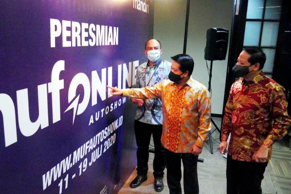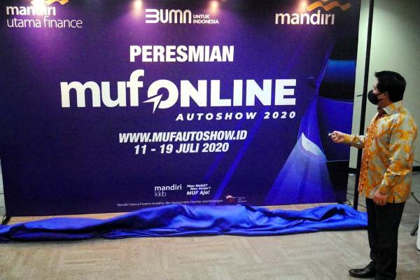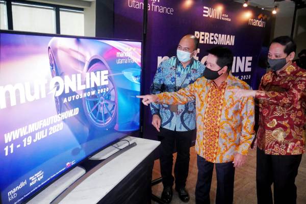 Presiden Direktur Mandiri Utama Finance (MUF) Stanley Setia Atmadja, Wadirut Bank Mandiri Hery Gunardi, dan EVP Consumen Loans Bank Mandiri Ignatius Susatyo Wijoyo (kiri ke kanan) saat menyaksikan seremoni event MUF Online Autoshow di Menara Mandiri, Jakarta, Rabu 15 Juli 2020. Bank Mandiri dan anak perusahaannya, Mandiri Utama Finance menghelat inovasi pameran otomotif online melalui website www.mufautoshow.id. pada 11 – 19 Juli 2020 nanti, dan dibuka untuk konsumen di wilayah Jabodetabek dan sekitarnya. Event ini menawarkan program pembelian mobil baru dengan pembiayaan berbunga 0% untuk merk tertentu, bunga mulai 2,99% untuk berbagai merk mobil lainnya, bunga mobil bekas mulai 6,75%, angsuran sepeda motor baru mulai Rp.19ribuan/hari.