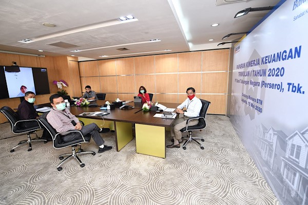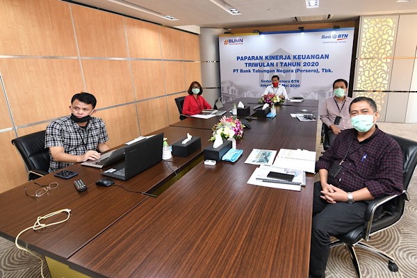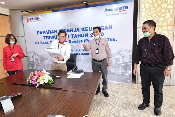 Direktur Utama PT Bank Tabungan Negara (Persero) Tbk. Pahala Nugraha Mansury (kedua kiri) didampingi Jajaran Direksi Bank BTN Elisabeth Novie, Nixon L.P. Napitupulu, dan Hirwandi Gafar tersenyum melihat laporan keuangan perseroan pada pembukaan siaran teleconference Konferensi Pers Paparan Kinerja Kuartal I-2020 di Jakarta, Jumat (15/5). Memasuki kuartal II-2020, Bank BTN optimistis tetap mampu mencatatkan kinerja on track kendati kondisi industri perbankan dan ekonomi nasional tengah mengalami kontraksi akibat pandemi. Kinerja tersebut ditopang bisnis yang tetap tumbuh, langkah efisiensi, dan upaya mempertebal likuiditas serta pencadangan yang telah dilakukan perseroan sejak tahun lalu. Data keuangan Bank BTN merekam perseroan menghasilkan pendapatan bunga senilai Rp6,17 triliun dan laba operasional sebelum provisi tercatat sebesar Rp870 miliar. (*)