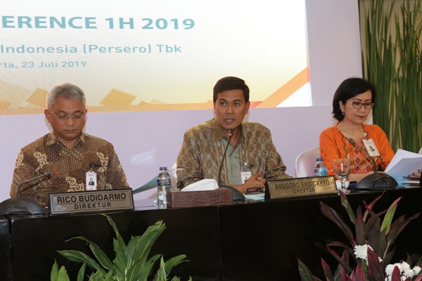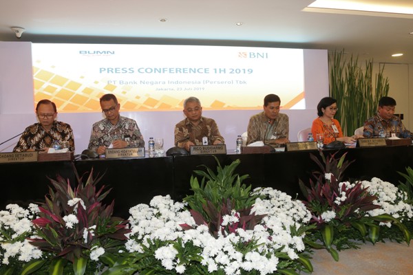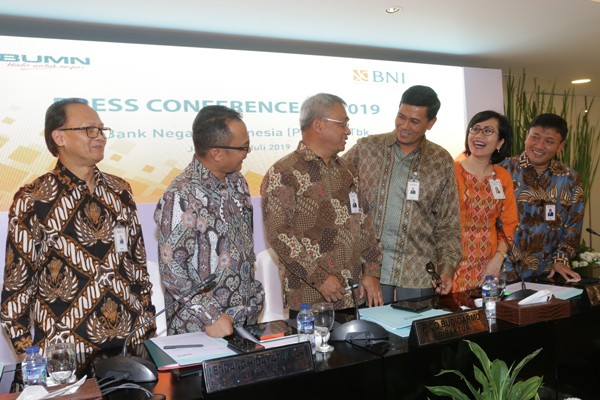 Direktur Keuangan PT Bank Negara Indonesia Tbk. Anggoro Eko Cahyo (ketiga kanan) bersama Direktur Bisnis Konsumer Tambok P Setyawati (kedua kanan), Direktur Tresuri dan Internasional Rico Rizal Budidarmo (ketiga kiri) dan Direktur Manajemen Risiko Bob Tyasika Ananta (kanan) memberikan penjelasan saat paparan kinerja Bank BNI Semester I/2019, di Jakarta, Selasa 23 Juli 2019. Bank BNI mencatatkan pertumbuhan kredit sebesar 20% secara year on year, yaitu dari Rp457,81 triliun pada semester I/2018 menjadi Rp549,23 triliun pada semester I/2019.