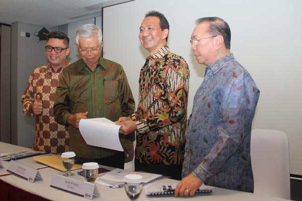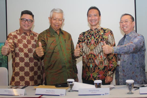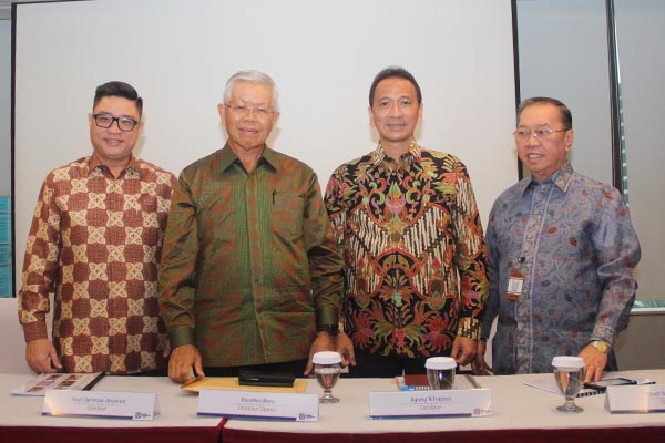 Direktur Utama PT Agung Podomoro Land Tbk (APLN) Bacelius Ruru (kedua kiri) berbincang bersama Direktur Paul Christian Ariyanto (kiri), Direktur Anak Agung Mas Wirajaya (kedua kanan) dan Direktur Caesar M Dela Cruz (kanan) usai public expose di Jakarta, Senin, 2 Desember 2019. Perusahaan membukukan penjualan dan pendapatan usaha sebesar Rp 2.922,2 miliar dalam Sembilan bulan di tahun 2019.