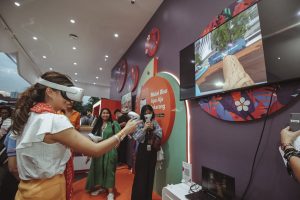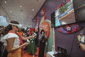 Brand Ambassador BNI Marianne Rumantir meramaikan Booth BNI Digital Experience dengan mencoba  berwisata di duniameta yang di dalamnya menampilkan booth digital BNI di Jakarta, Sabtu 28 Mei 2022.